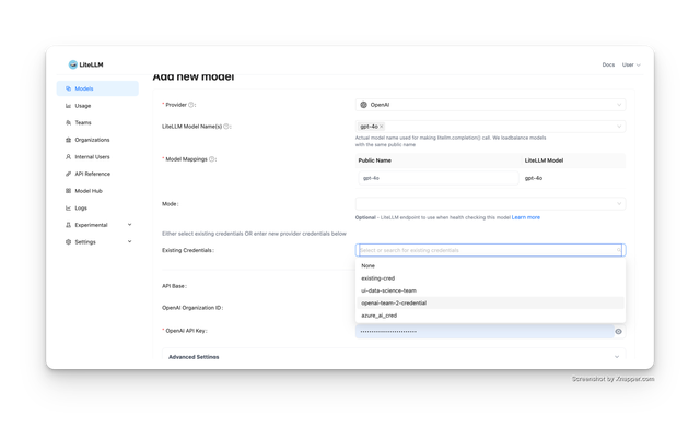 You can add LLM provider credentials on the UI. Once you add credentials you can reuse them when adding new models